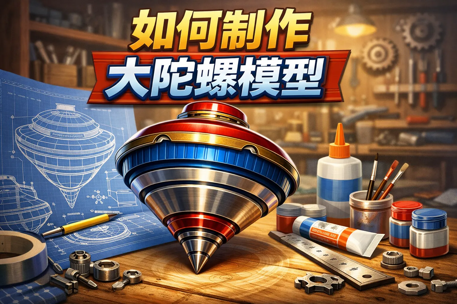 制作大陀螺模型常用的材料包括木板或塑料片作为陀螺的主体,轴心通常使用圆棒或螺丝,粘合剂如强力胶水,以及砂纸用于打磨表面。工具方面可能需要剪刀、刻刀、钻孔器和细致的绘画工具以完成细节装饰。