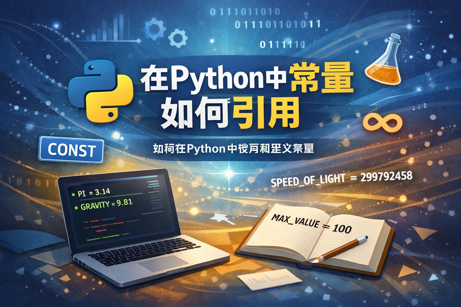 Python没有内置的常量类型,通常通过全大写字母的变量名来表示常量,例如MY_CONSTANT = 10。引用时直接使用该变量名即可。在模块中定义常量变量并导入,可以方便地在多个地方引用和修改。