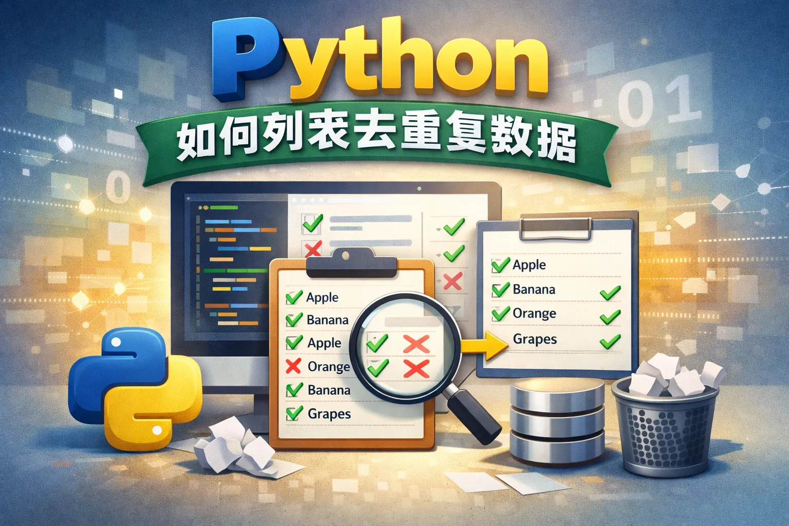 Python中去除列表重复元素的常用方法有:使用set()函数将列表转换为集合,从而去重;利用字典的键唯一性特性,通过字典从列表中筛选唯一元素;采用列表推导结合条件判断来去重;或者使用collections模块中的OrderedDict以保持元素顺序去重。