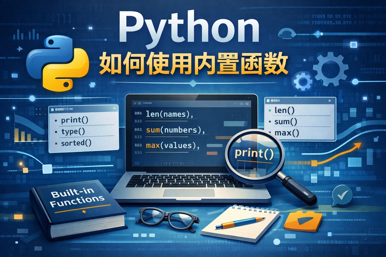 Python内置函数非常丰富,常用的包括print()用于输出信息,len()用于获取序列长度,type()查看变量类型,range()生成数字序列,input()获取用户输入,int()和str()用于类型转换。掌握这些函数能帮助你更高效地编写代码。