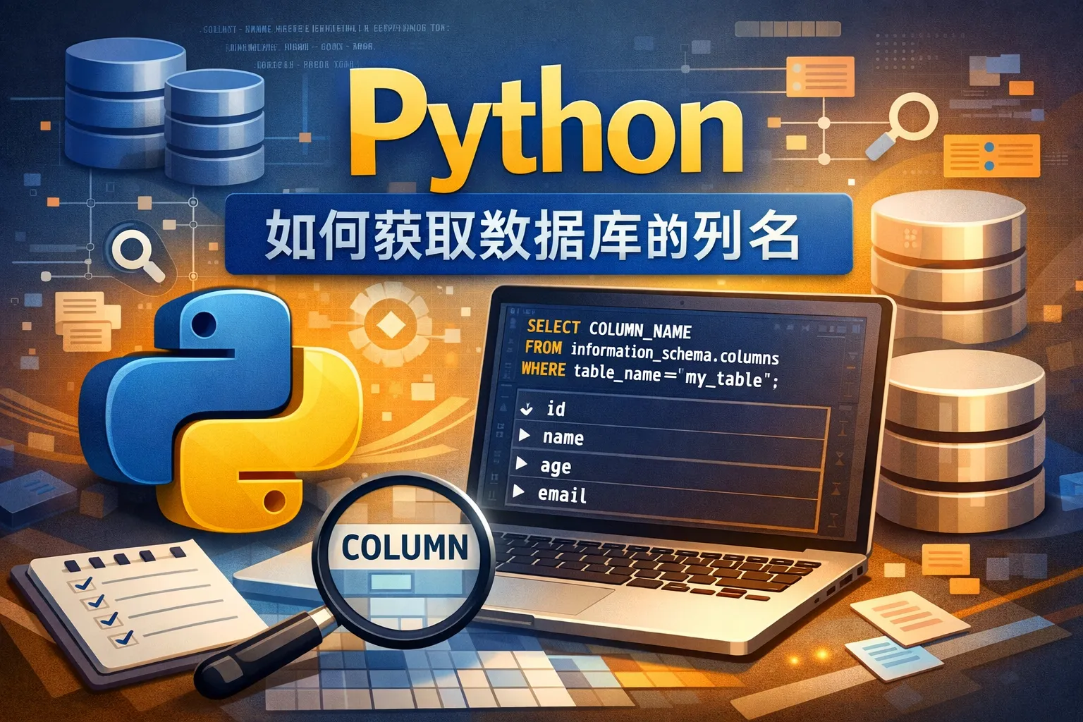 首先,选择合适的数据库驱动库,比如sqlite3、PyMySQL、psycopg2等。然后通过连接对象获取游标,用SQL语句查询表结构或者执行特定的API来获取列名。例如,用sqlite3连接后,可以执行PRAGMA table_info(table_name)命令,PyMySQL则可以通过cursor.description属性获取列信息。