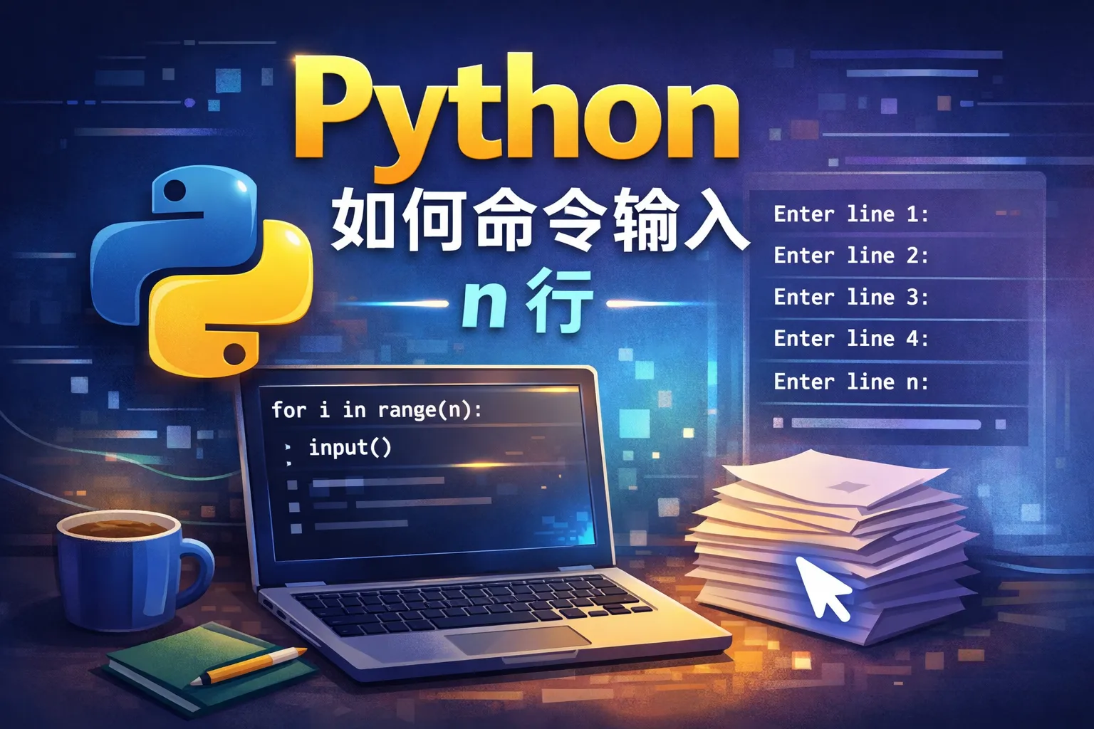 可以先通过input()函数读取一个整数n,表示要输入的行数,然后用for循环调用input() n次,每次读取一行数据。这样就能实现命令行输入n行内容。