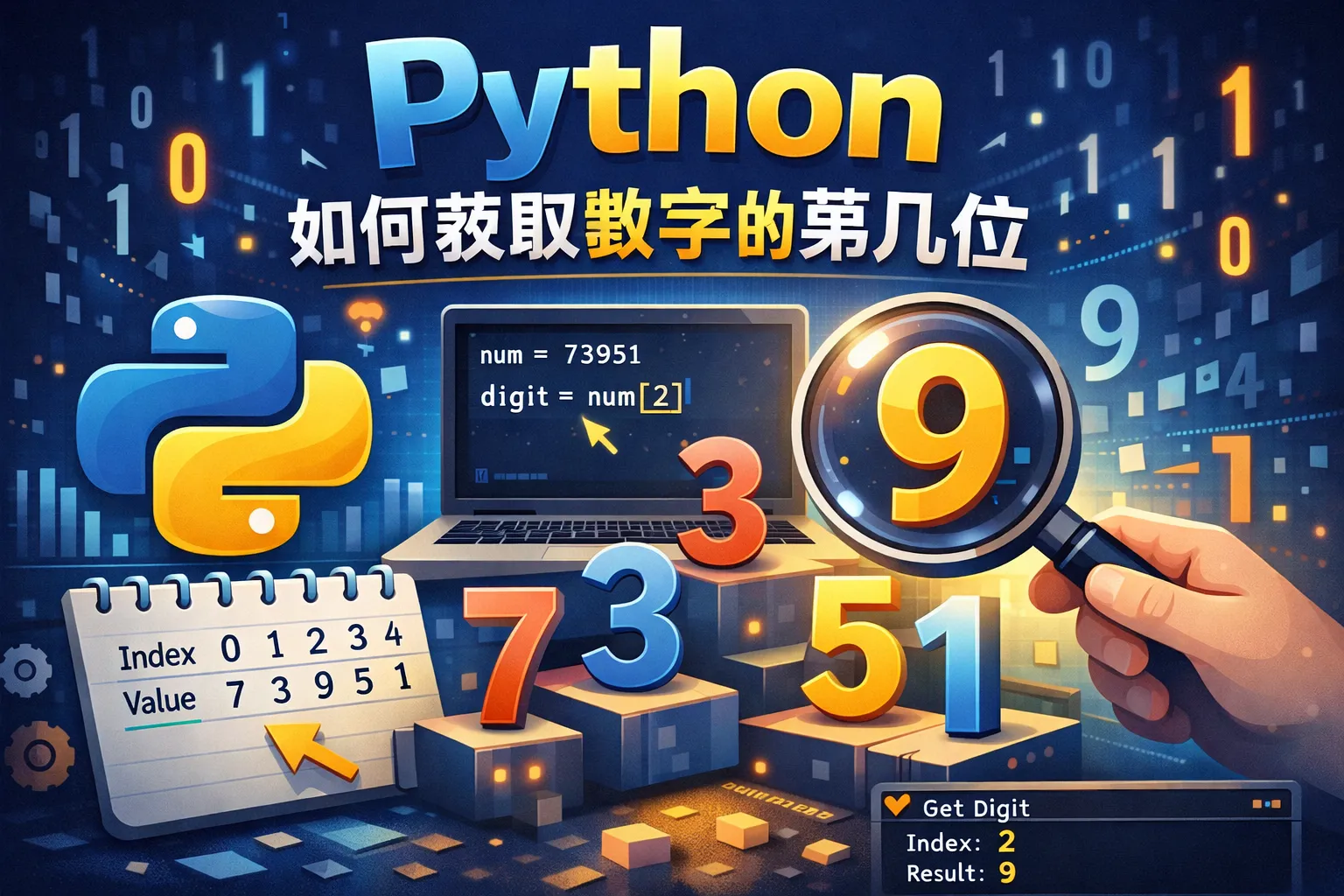 你可以先将数字转换为字符串形式,通过索引访问特定位数的数字。例如,str(num)[index]可以获得对应位置的字符,再转回整数。另外,使用数学运算,比如整除和取余,也能找到特定位的数字。
