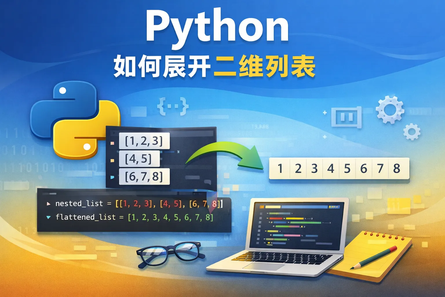 除了列表推导式,还可以使用 itertools 模块中的 chain 函数,如:import itertools; flat_list = list(itertools.chain.from_iterable(two_dim_list))。另外,使用 NumPy 库时,可以调用 numpy.ndarray.flatten() 方法将数组展开为一维。