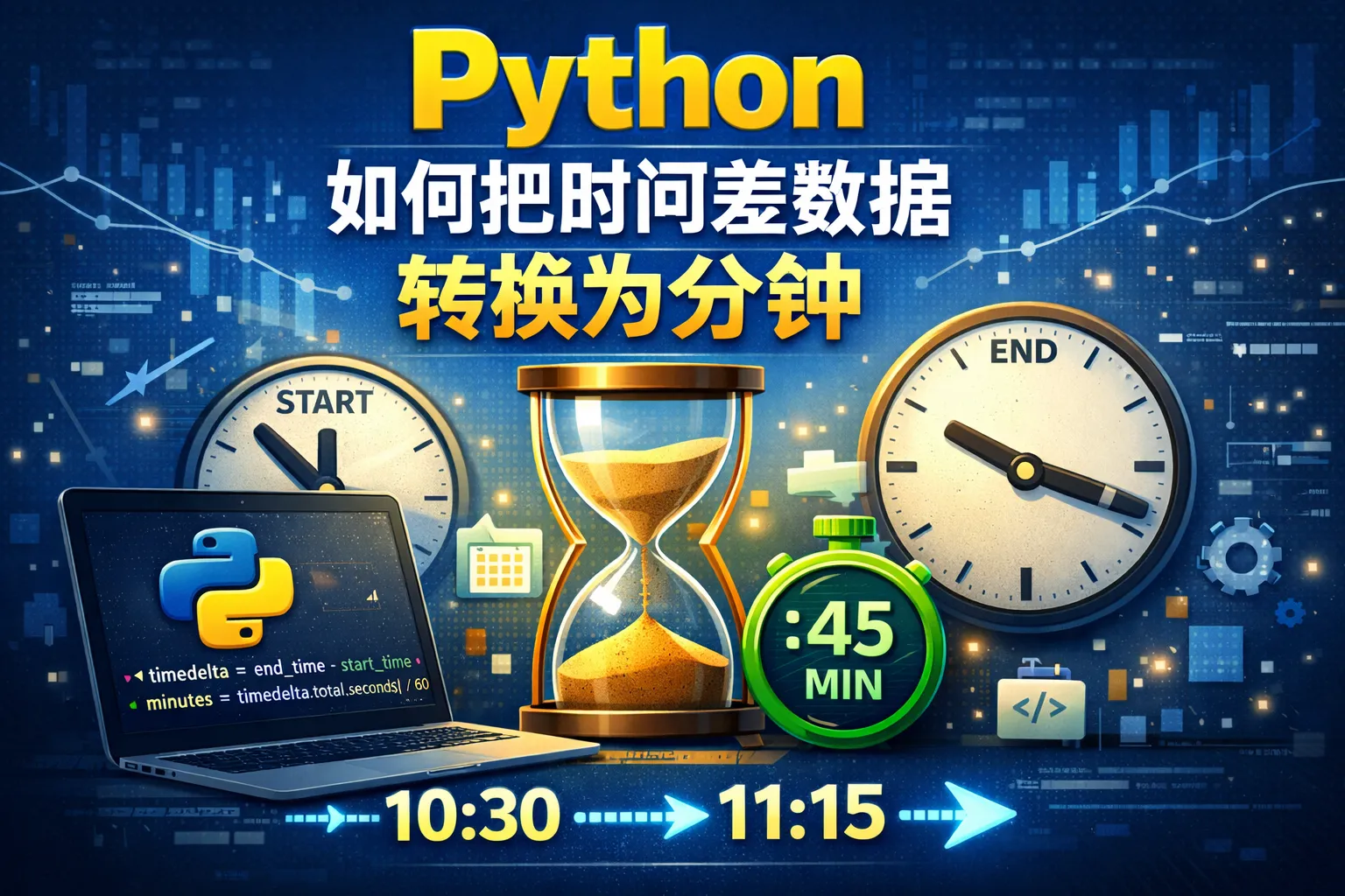 可以调用timedelta对象的total_seconds()方法获得总秒数,然后除以60即可获得总分钟数,确保分钟数是浮点数。