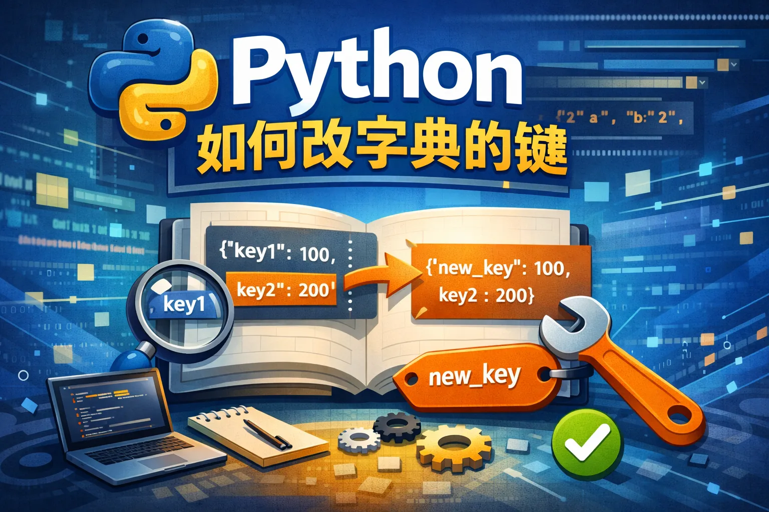 可以使用字典推导式创建一个新的字典,将旧键替换为新键。例如:new_dict = {new_key if k == old_key else k: v for k, v in original_dict.items()},这样可以灵活地批量替换多个键。