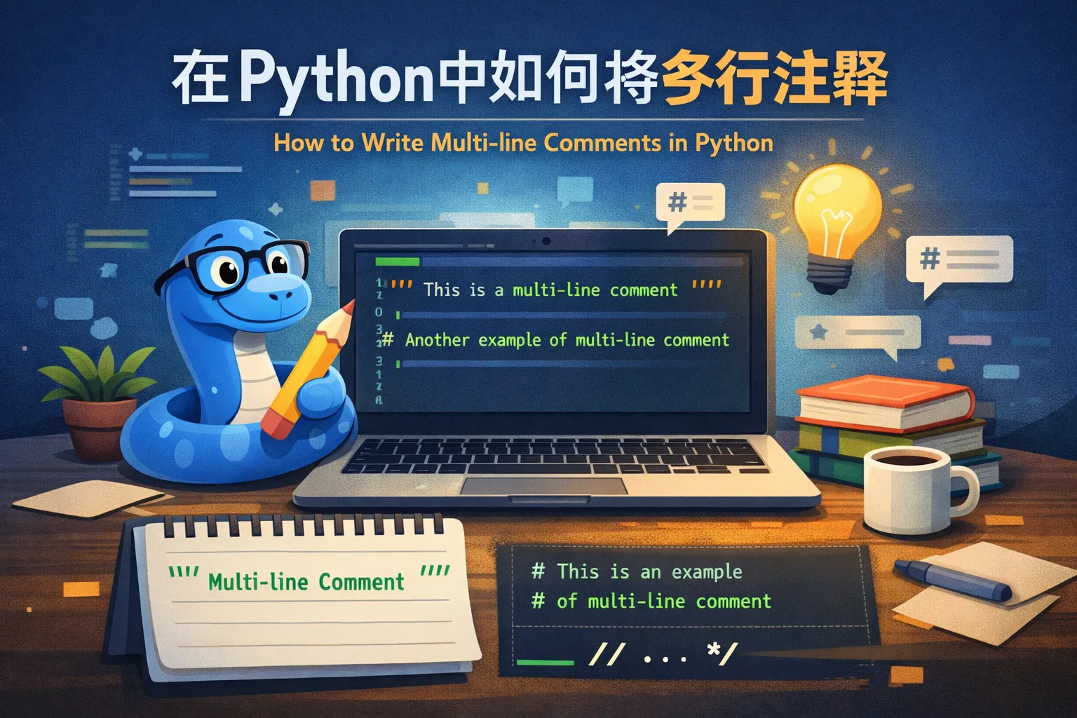使用多行字符串或多个单行注释来实现多行注释