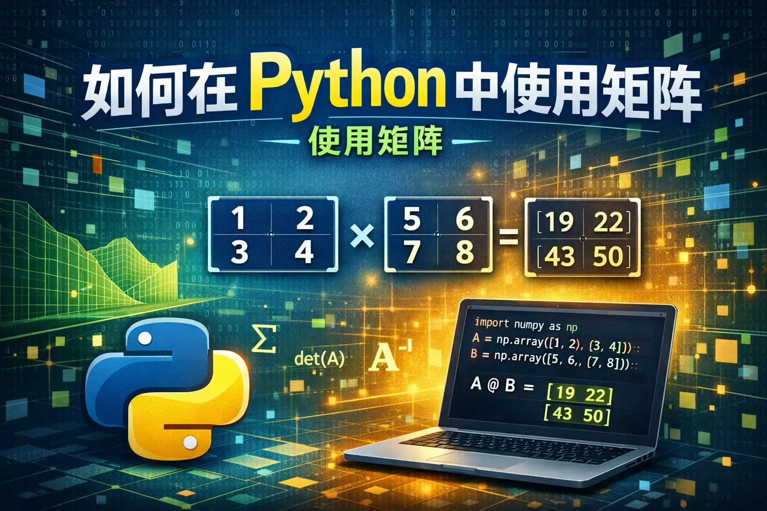 使用NumPy库,可以用np.dot()函数或者运算符@完成矩阵乘法,例如: