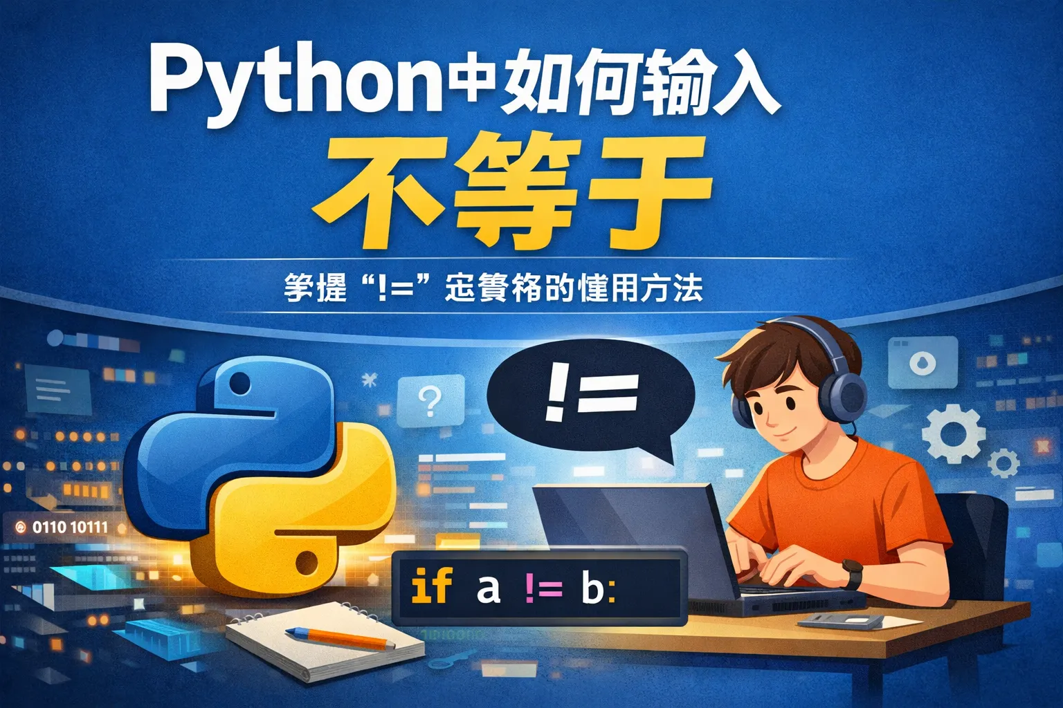Python中使用 != 作为不等于运算符,用于判断两个值是否不相等。如果表达式 a != b 为真,表示a和b不相等。