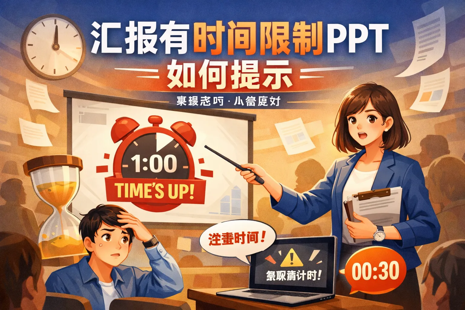 在制作汇报PPT时,怎样有效地提示演讲者注意时间限制?