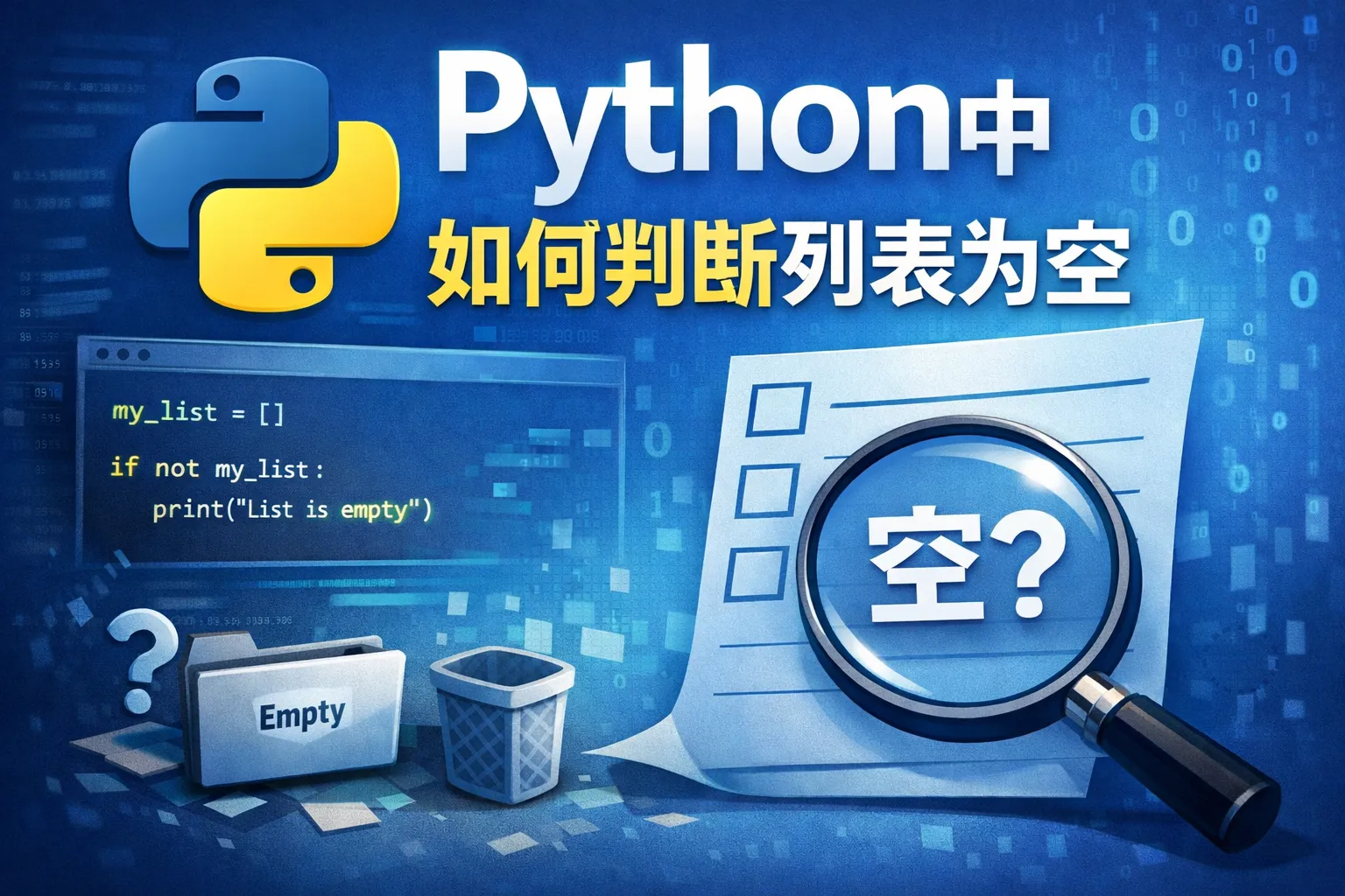 可以直接通过 if not list_name 来判断列表是否为空,因为空列表在布尔上下文中会被评估为False。如果列表为空,条件成立。示例代码: