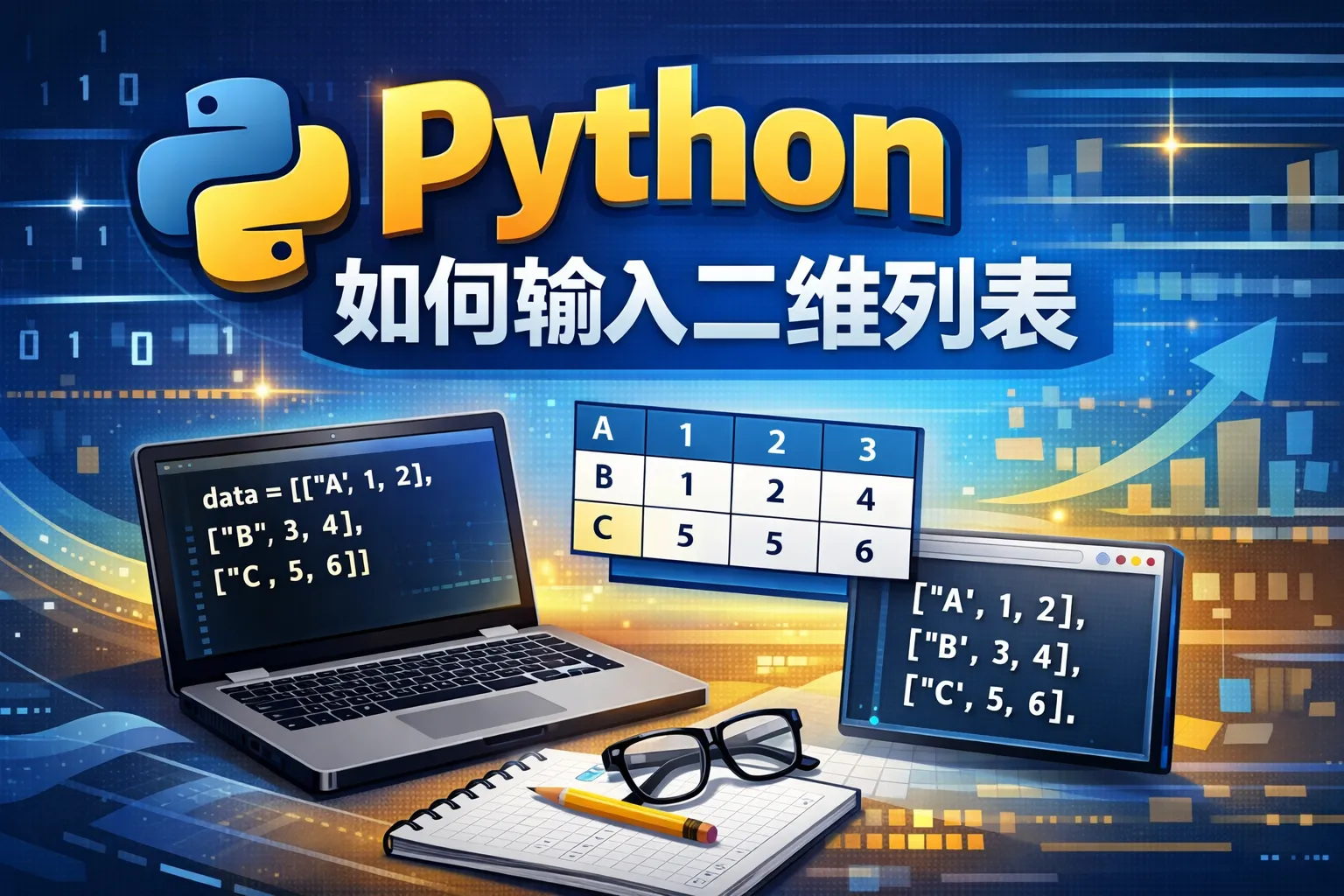 一种常见方法是先输入行列数量,然后使用循环逐行输入数据,例如每次接收一行数字字符串,使用split()分割后转换成整数或其他类型,并追加到列表中。示例代码: