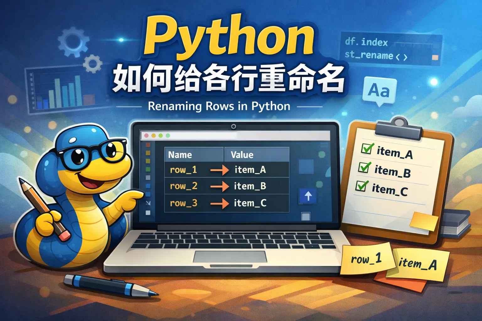 可以通过赋值给df.index数组的方式批量修改行名,确保传入的列表长度与原行数一致。另外,也可以结合列表推导或者映射函数对现有index进行转换,生成新的行名称。