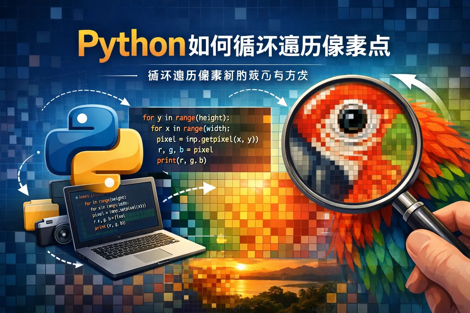 可以先获取图片宽度和高度,然后嵌套两个for循环,外层遍历y轴,内层遍历x轴,通过(x, y)依次访问每个像素点。比如:for y in range(height): for x in range(width): pixel = img.getpixel((x,y))