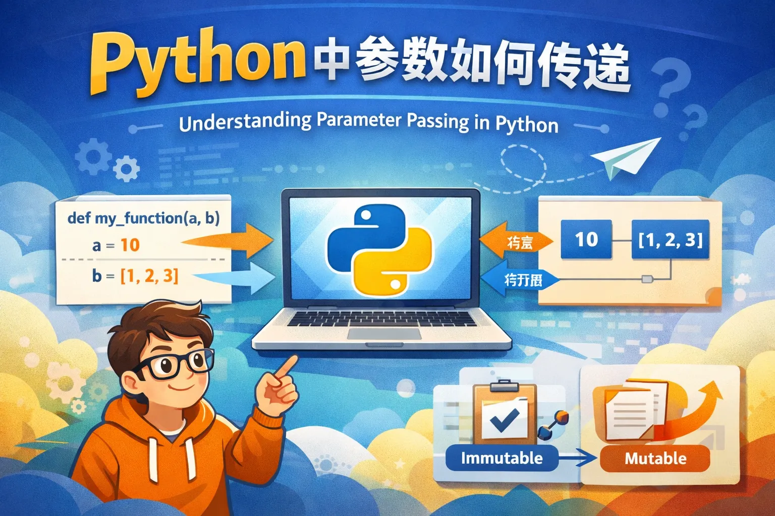 Python中参数传递采用的是“传对象引用”的机制,也称为“赋值语义”。这意味着函数接收到的是实参对象的引用,而不是对象的副本。对于不可变类型,如整数、字符串,函数内部无法修改原始对象;而对于可变类型,如列表、字典,函数内部修改对象将影响到原始对象。