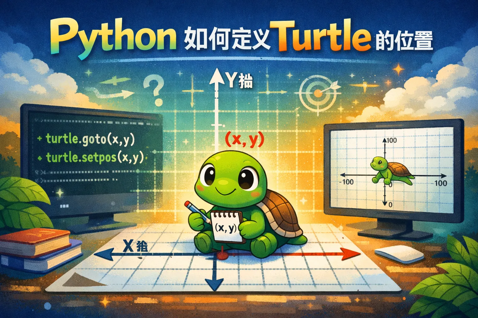turtle画布默认以画布中心点为原点(0,0),x轴向右递增,向左递减;y轴向上递增,向下递减。定义turtle位置时,传入的(x, y)值是相对于中心点的偏移量,这样便于精准定位乌龟的位置。