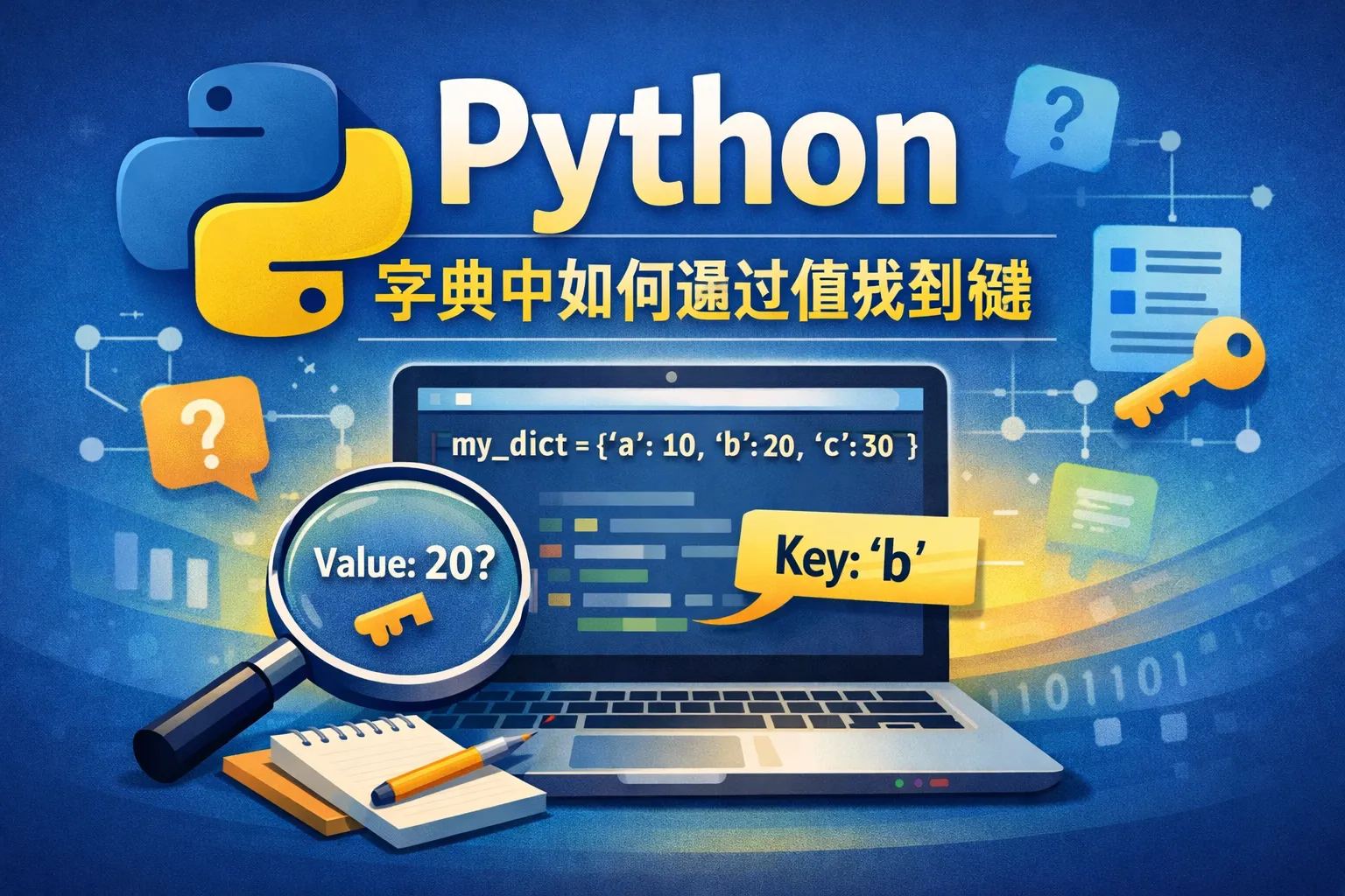 Python字典是键值对的集合,直接通过值查找键不是内置功能。可以遍历字典的items(),找到匹配的值后返回对应的键。例如使用for循环检查每对键值,匹配到目标值时获取键。