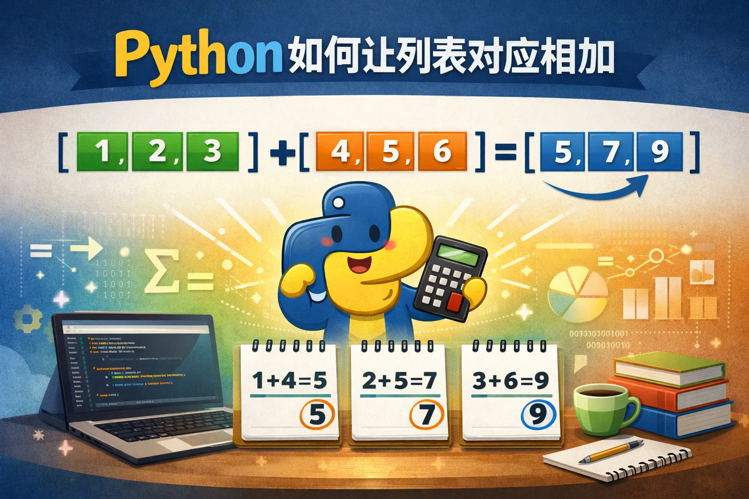 可以使用列表推导式结合zip函数,实现两个列表中对应元素的相加操作。例如,a = [1, 2, 3], b = [4, 5, 6],通过代码[c + d for c, d in zip(a, b)]即可得到[5, 7, 9]。