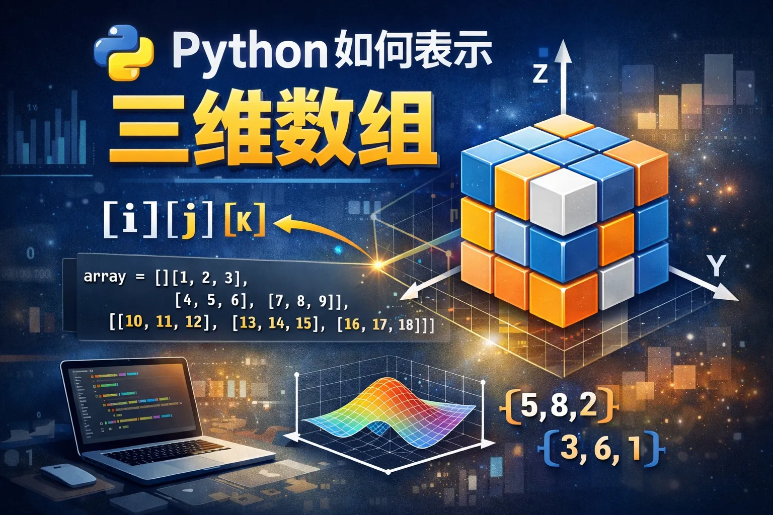 Python标准库中没有直接支持多维数组的数据结构,但可以使用嵌套列表来表示三维数组,也可以利用第三方库如NumPy,通过numpy.array或numpy.zeros函数轻松创建和操作三维数组。