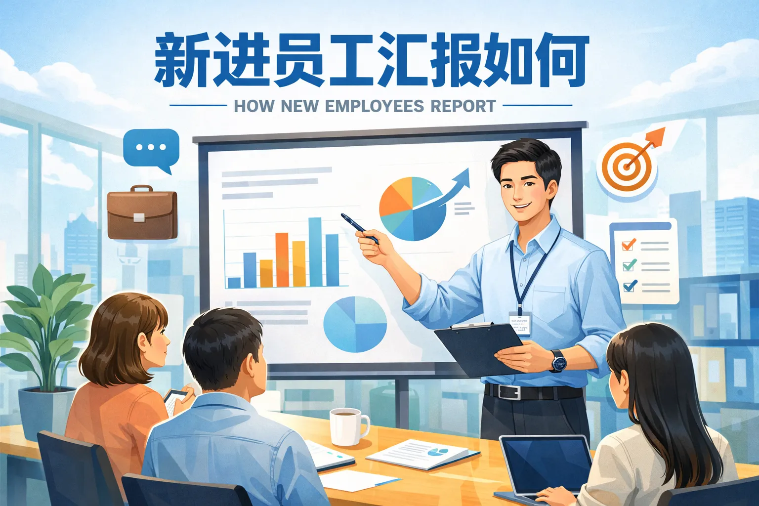 建议新员工提前准备汇报内容,结构清晰,语言简练,并结合具体数据或案例支撑观点。保持自信的语气和适当的眼神交流,能增强汇报的感染力。