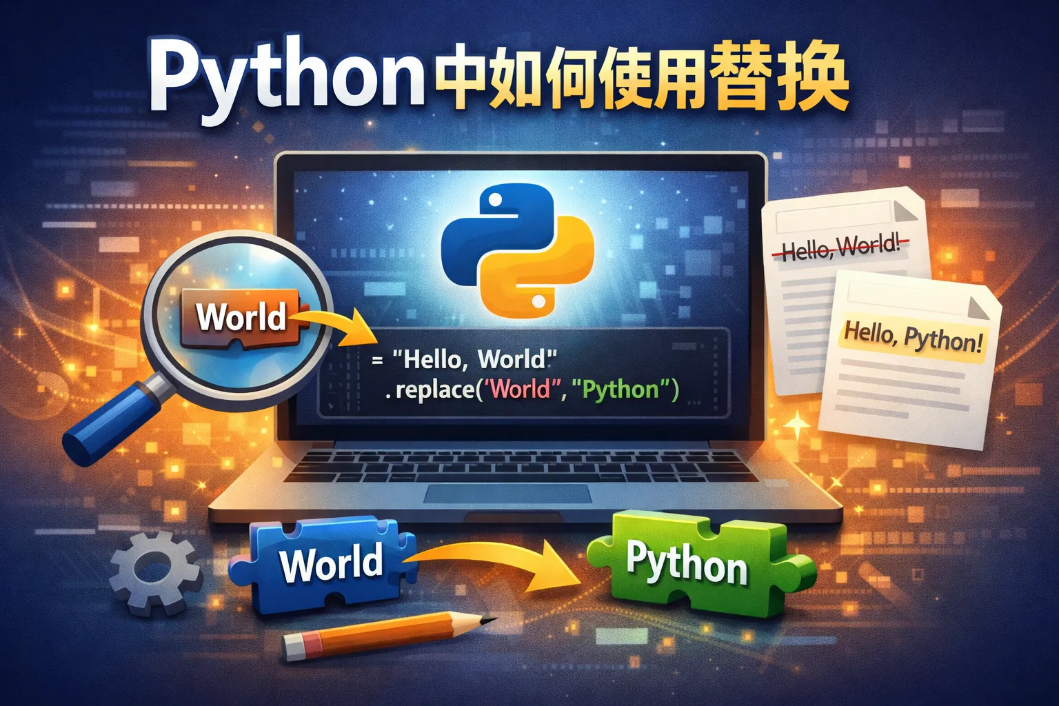 Python提供了字符串对象的replace方法,可以用来替换字符串中的指定子串。用法是str.replace(old, new),它会返回一个新的字符串,把所有的old子串替换为new。例如:'hello world'.replace('world', 'Python')将得到'hello Python'。