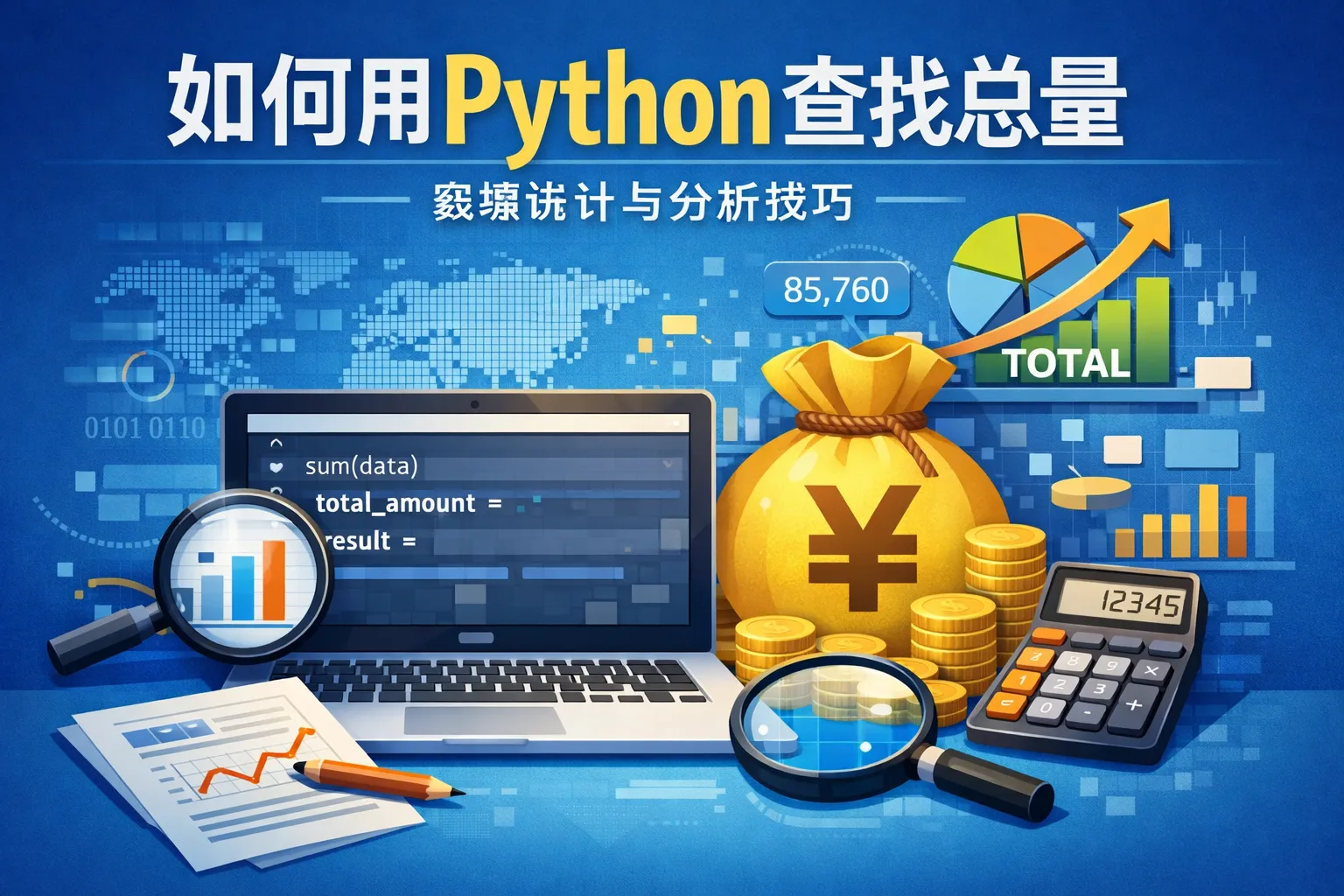 可以使用内置的sum()函数来计算一组数值的总和。例如,对列表numbers调用sum(numbers)即可。如果数据存储在Pandas的DataFrame中,可以使用df['列名'].sum()计算该列的总量。