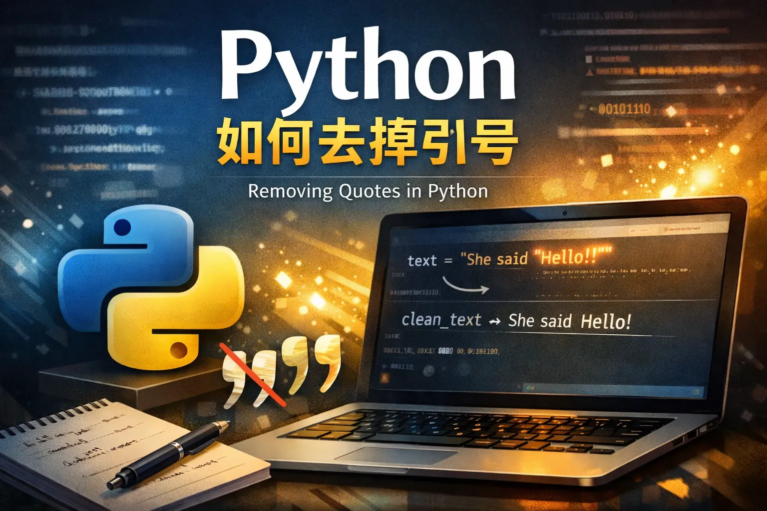 如果字符串内容本身包含引号字符,可以使用字符串的replace()方法删除它们。例如,使用s = '"hello"',可以调用s = s.replace('"', ''),执行后s变为hello,不含任何引号字符。同理,可以替换单引号或其他类型的引号。