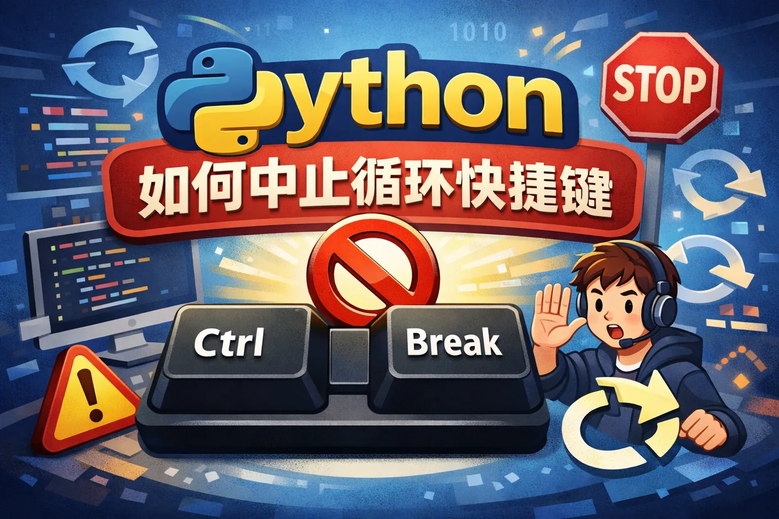 当Python程序中的循环陷入无限状态,可以通过按下键盘上的 Ctrl + C 组合键来发送中断信号,这会触发KeyboardInterrupt异常,终止当前循环并停止程序运行。