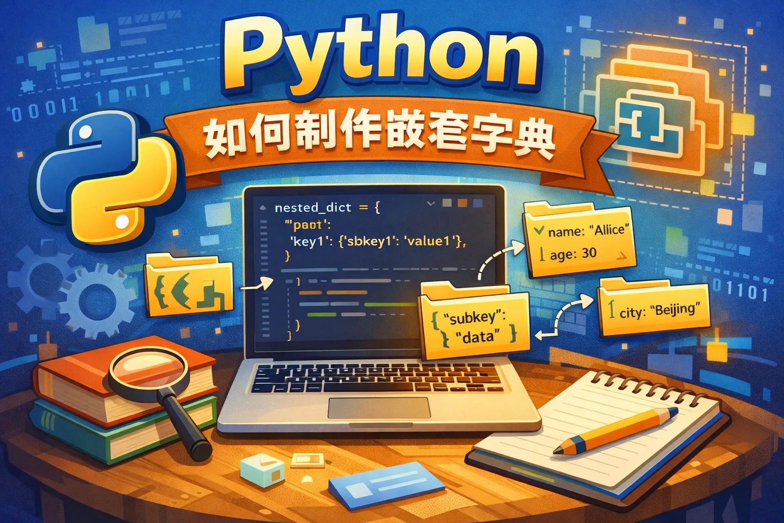 利用多层索引访问内部元素,例如要访问nested_dict['key1']['subkey2']的值,可以直接使用该语法。修改操作类似,赋新值给对应的层级路径即可,比如nested_dict['key2']['subkeyA'] = 'newValue'。这种方式可以灵活操作嵌套结构中的具体数据。