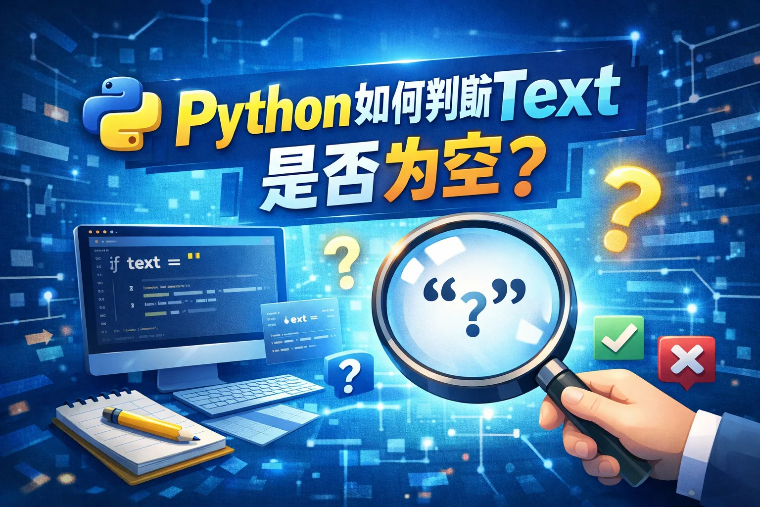 可以使用条件语句 if not text 或 if text is None or text.strip() == '' 来判断。第一种方式 if not text 会同时判断 None 和空字符串,适合简单情况。第二种方式更严格,确保文本没有实际内容(包括仅含空白),适用场景更广。
