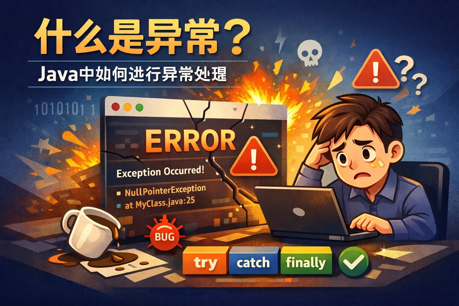 Java使用try-catch块来捕获异常,将可能抛出异常的代码放入try块,出现异常时由catch块捕获并处理,从而避免程序崩溃。此外,还可以使用finally块执行无论是否发生异常都需要执行的代码。