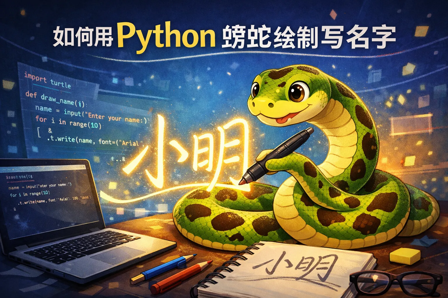可以借助Python内置的write函数配合Turtle模块快速写名字,也可以使用Pillow等图形库将文字转换为路径,再用Turtle绘制。这样省去了手工编写每个字母的复杂步骤,实现自动化绘制效果。