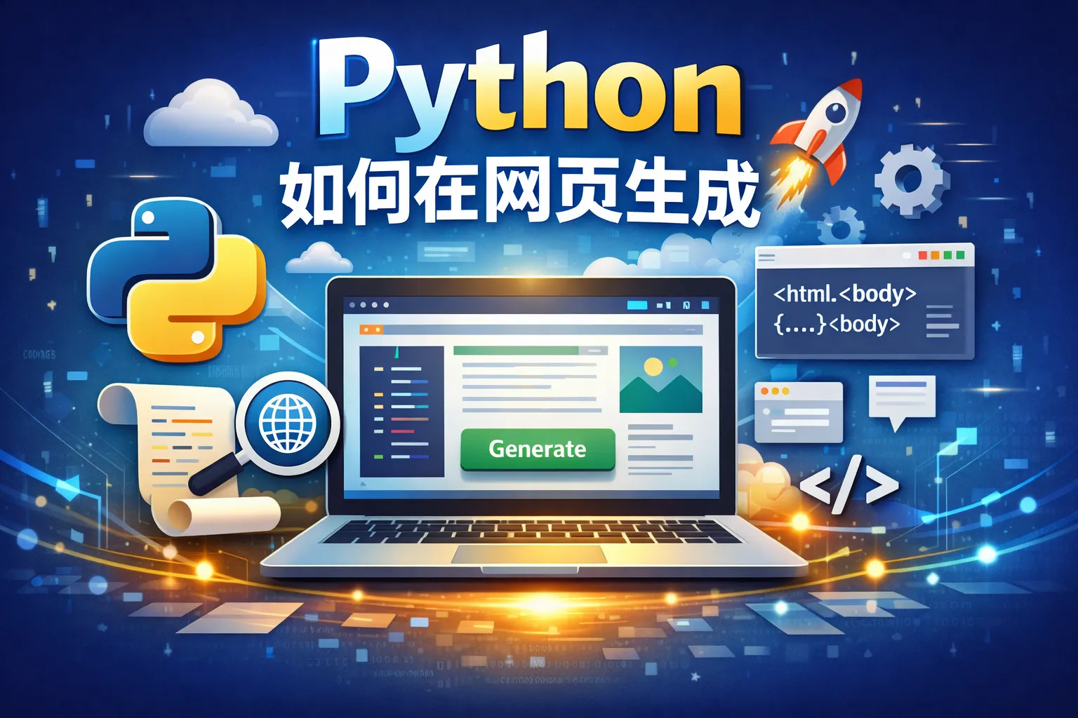 可以通过Python的各种库生成网页内容,比如使用Flask或Django搭建网站,或者使用Jinja2模板引擎动态渲染HTML。也可以直接用Python脚本生成HTML文件,然后通过浏览器打开查看。