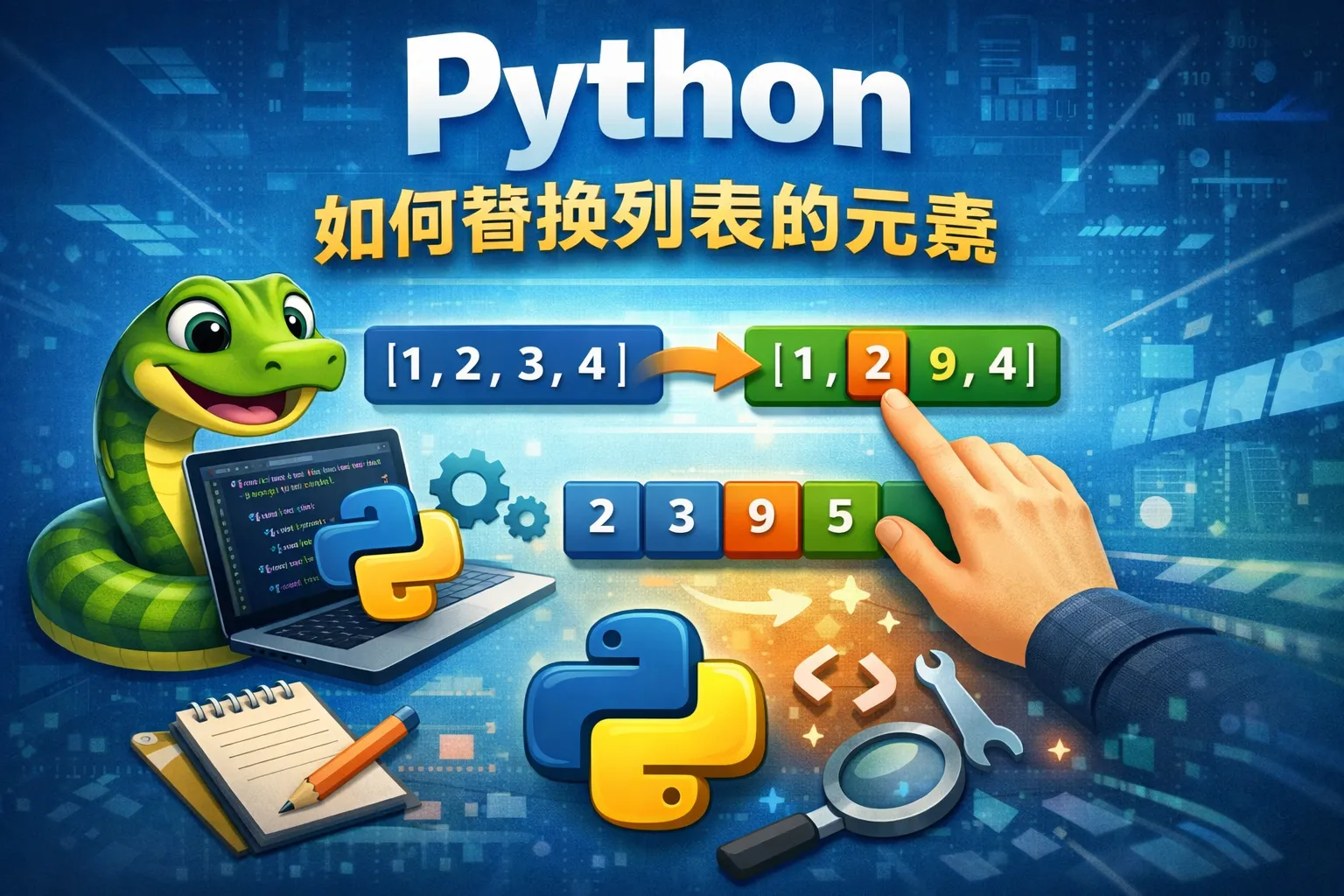 对于连续元素,可以通过列表切片赋值来替换,例如lst[1:4] = [new1, new2, new3]。如果替换不连续元素,可以使用循环配合索引逐个修改。