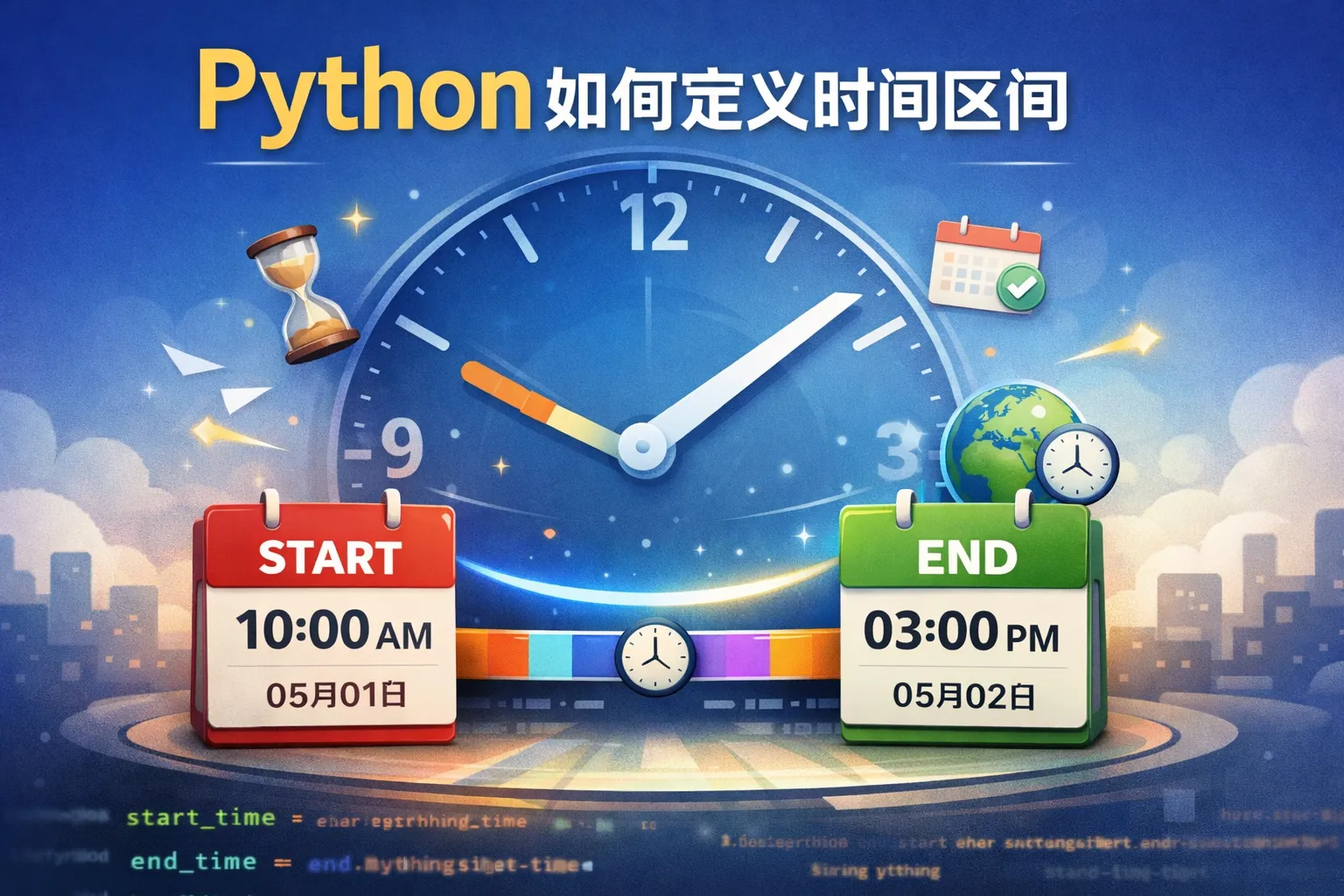 可以使用Python内置的datetime模块,分别用datetime.datetime对象表示开始时间和结束时间。例如,start_time = datetime.datetime(2023, 5, 1, 8, 0, 0) 表示5月1日上午8点,end_time = datetime.datetime(2023, 5, 1, 18, 0, 0) 表示5月1日下午6点。这样就确定了一个时间区间。