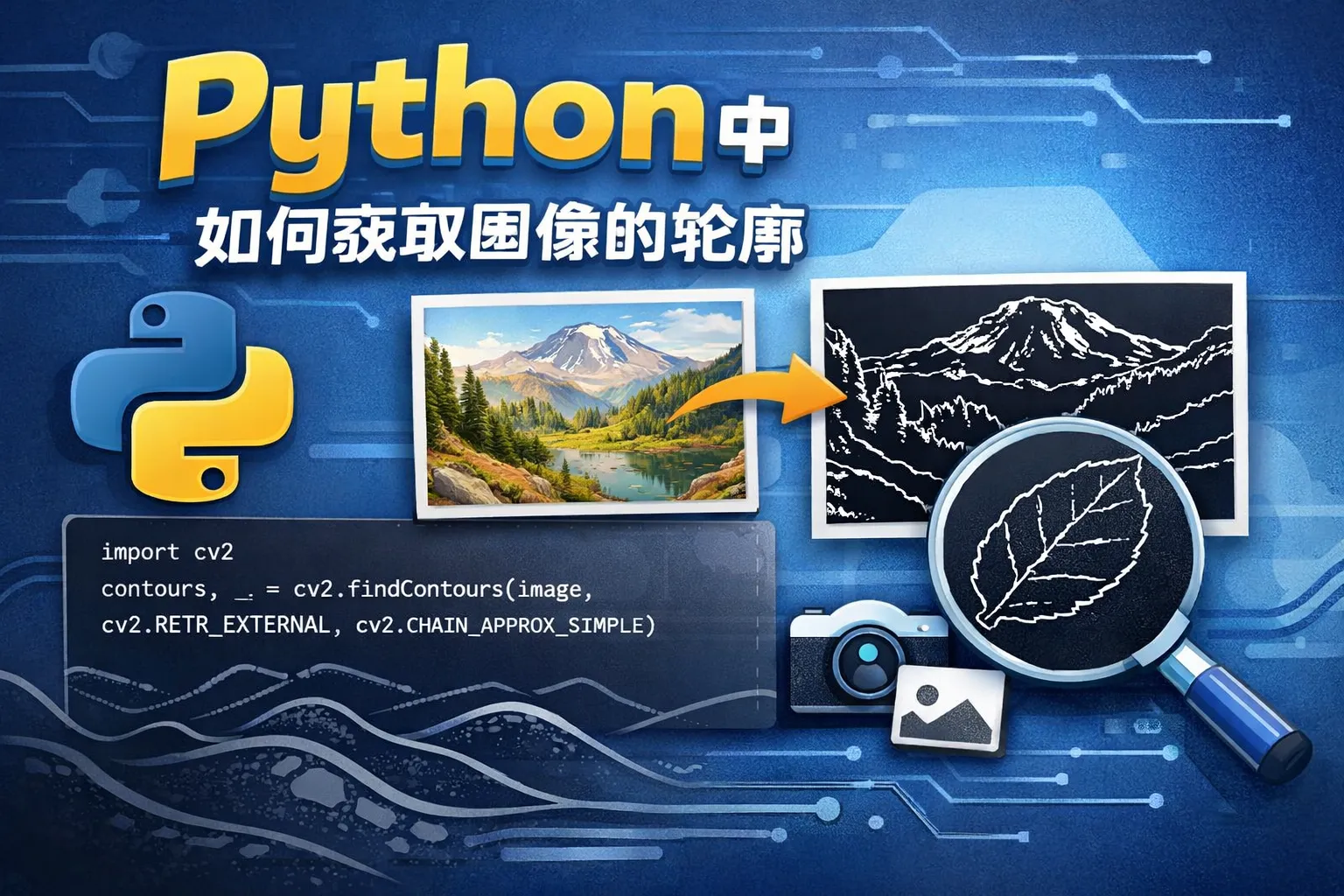 在Python中,可以通过OpenCV的cv2.findContours函数来获取图像中的轮廓。通常步骤包括先将彩色图片转为灰度图,采用阈值处理或边缘检测,接着调用findContours方法提取轮廓信息,最后对提取的轮廓进行绘制或分析。