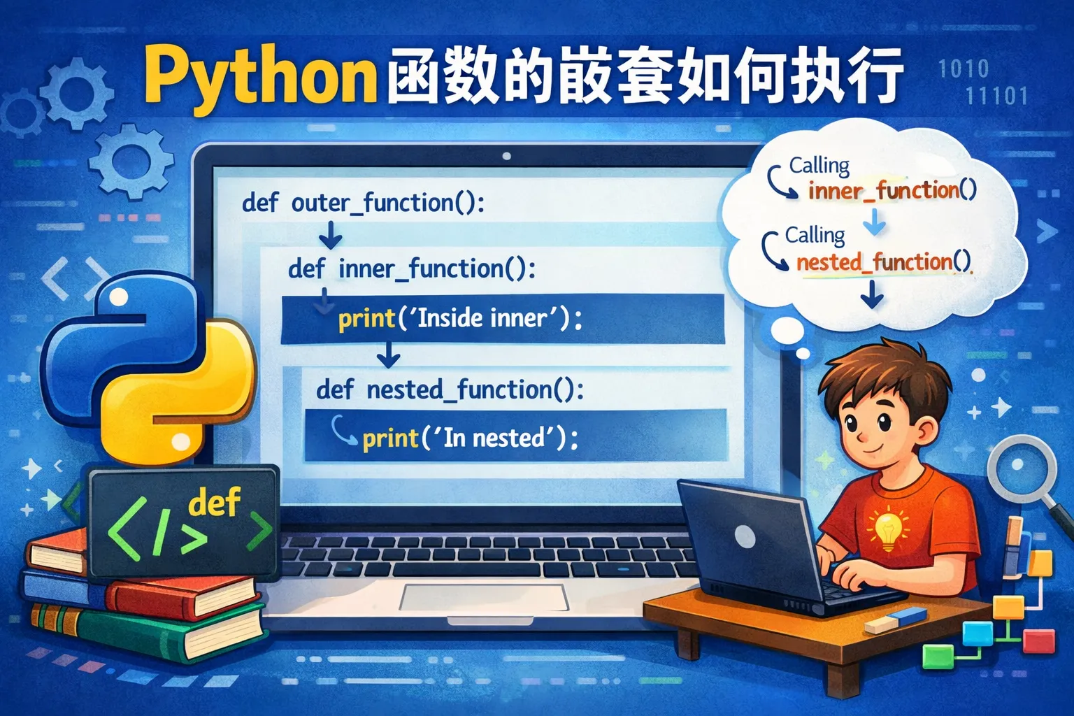 在Python中,嵌套函数可以访问其外层函数的变量,这种行为称为闭包(closure)。内部函数能够引用外部函数的局部变量,而外部函数则无法直接访问内部函数的变量。变量的查找顺序遵循LEGB规则:本地(Local),闭包函数外的函数(Enclosing functions),全局(Global),内置(Built-in)。