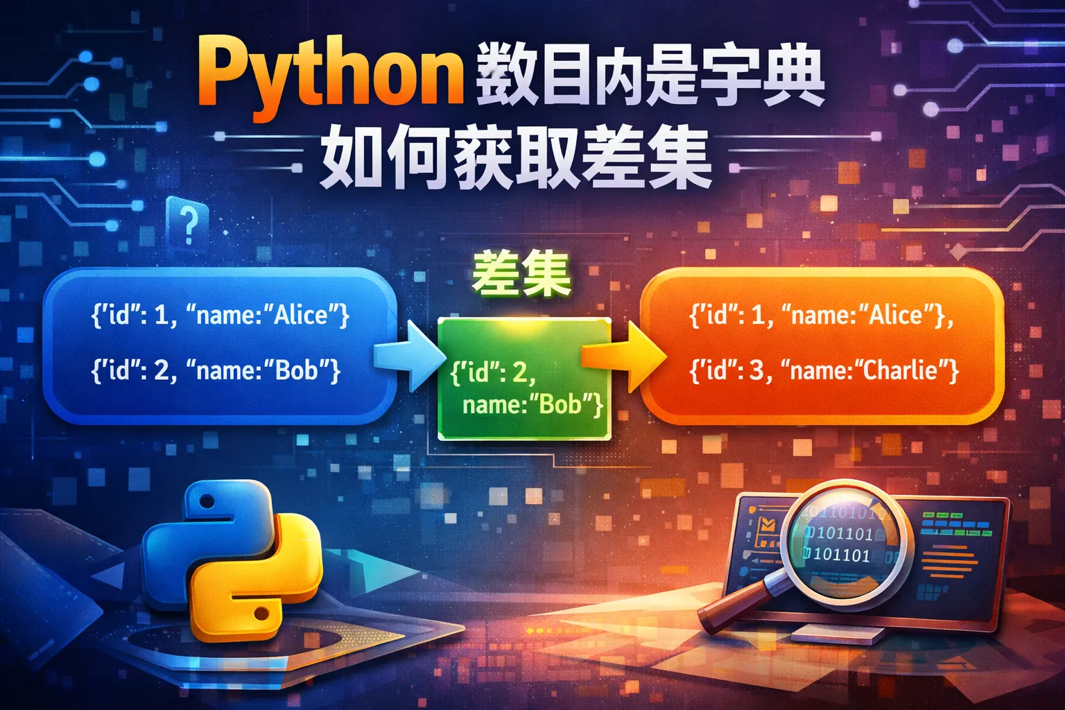 由于字典是不可哈希类型,不能直接放入集合。可以将字典转换为元组(如元组包含字典的键值对),或者使用自定义函数进行比较,再通过列表推导获取差集。也可以借助pandas库来比较两个字典列表的差异。