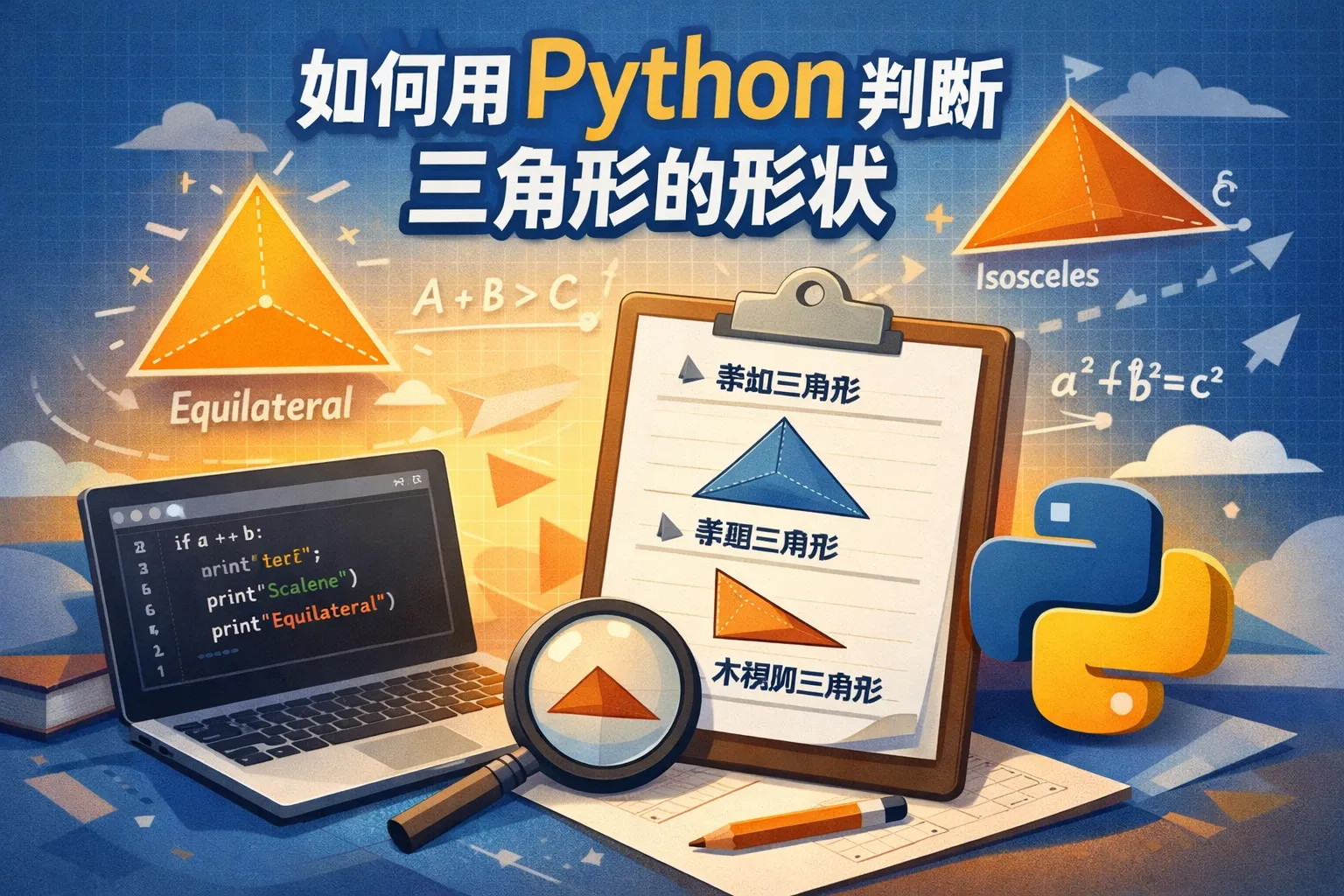 判断三条边是否能构成三角形,需要先验证三角形不等式,即任意两边之和大于第三边。代码中可以通过判断 a + b > c、a + c > b 以及 b + c > a 来实现。确认是三角形后,若三边相等则为等边三角形,若两边相等则为等腰三角形,若三边均不相等则为不等边三角形。