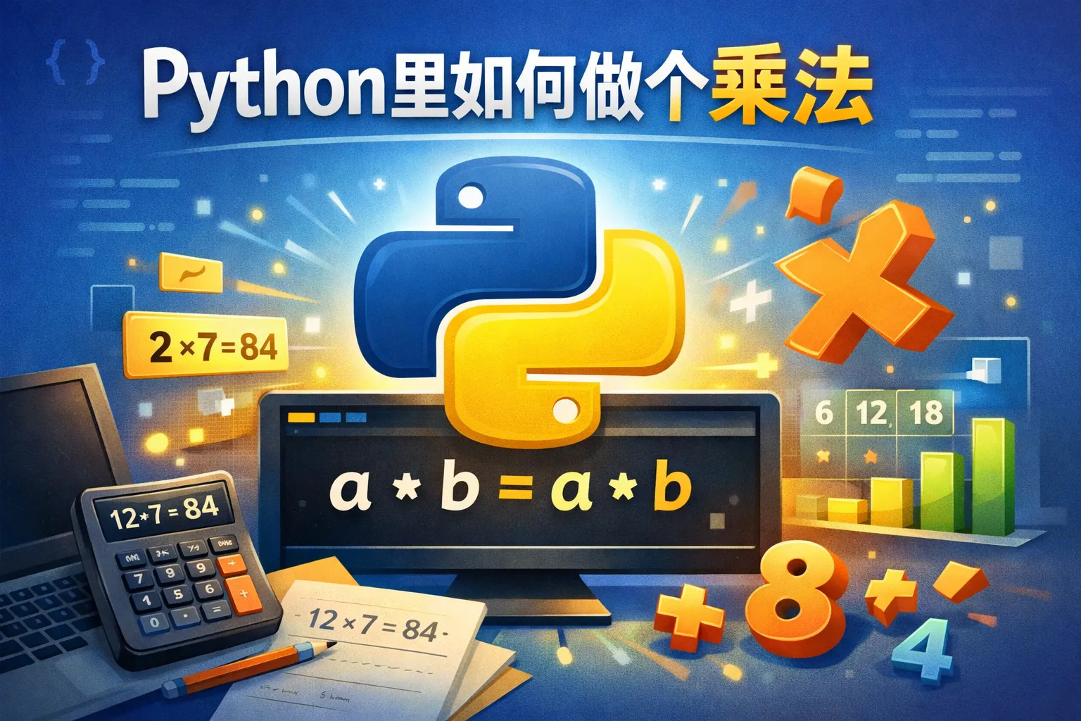 在Python中,可以使用星号(*)作为乘法运算符。比如,计算3和4的乘积可以写为:result = 3 * 4。执行后,result的值就是12。