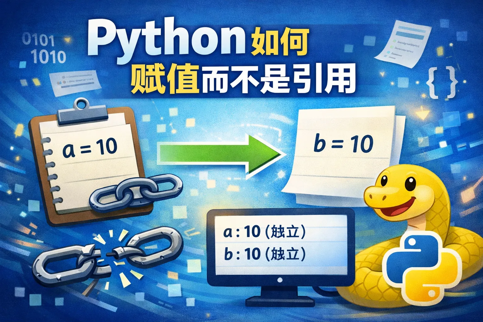 Python中,赋值操作默认是绑定对象的引用,不会复制对象内容。如果需要变量独立,应该使用复制方法。对于可变对象,可以使用copy模块中的copy()进行浅复制,或者deepcopy()进行深复制。这样赋值后,两个变量指向不同的对象,互不影响。