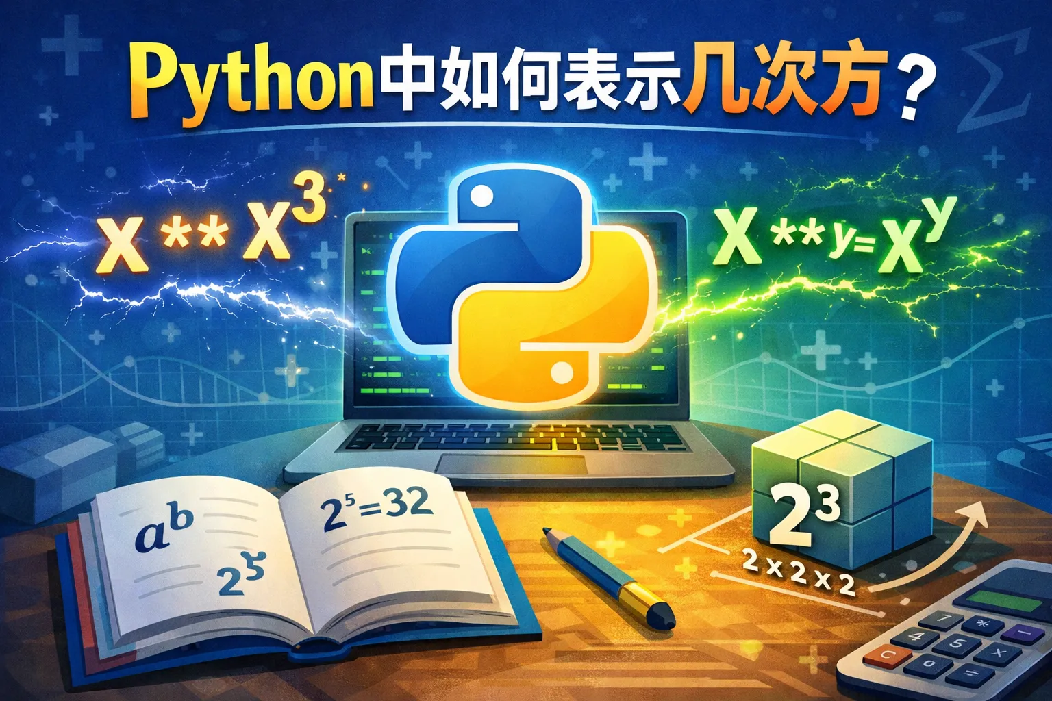 在Python中,可以使用双星号()运算符对数字进行幂运算。例如,计算2的3次方可以写作23,结果是8。