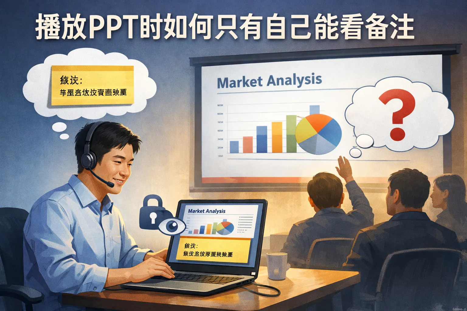 打开PPT的演讲者视图功能后,你的电脑屏幕会显示当前幻灯片和备注内容,而投影仪或外部显示屏只会展示幻灯片内容,确保观众无法看到备注。通常在“幻灯片放映”选项里启用演讲者视图即可。