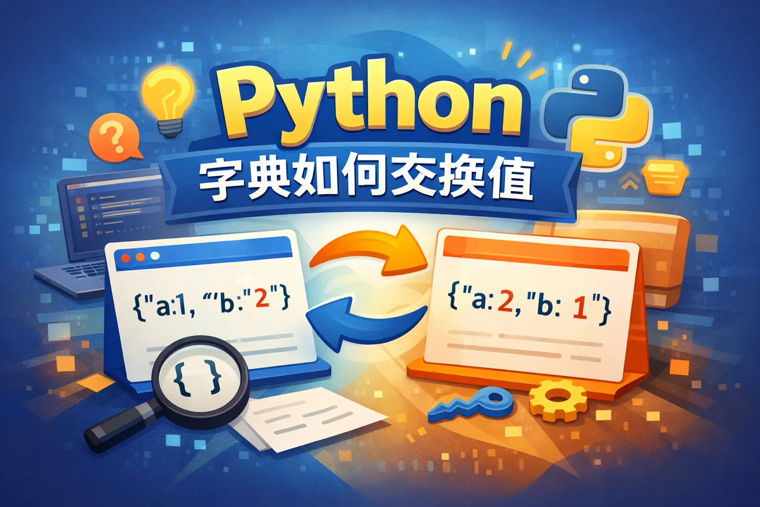Python支持同时赋值,可以用元组解包的方法直接交换两个键的值,无需借助临时变量。示例代码: