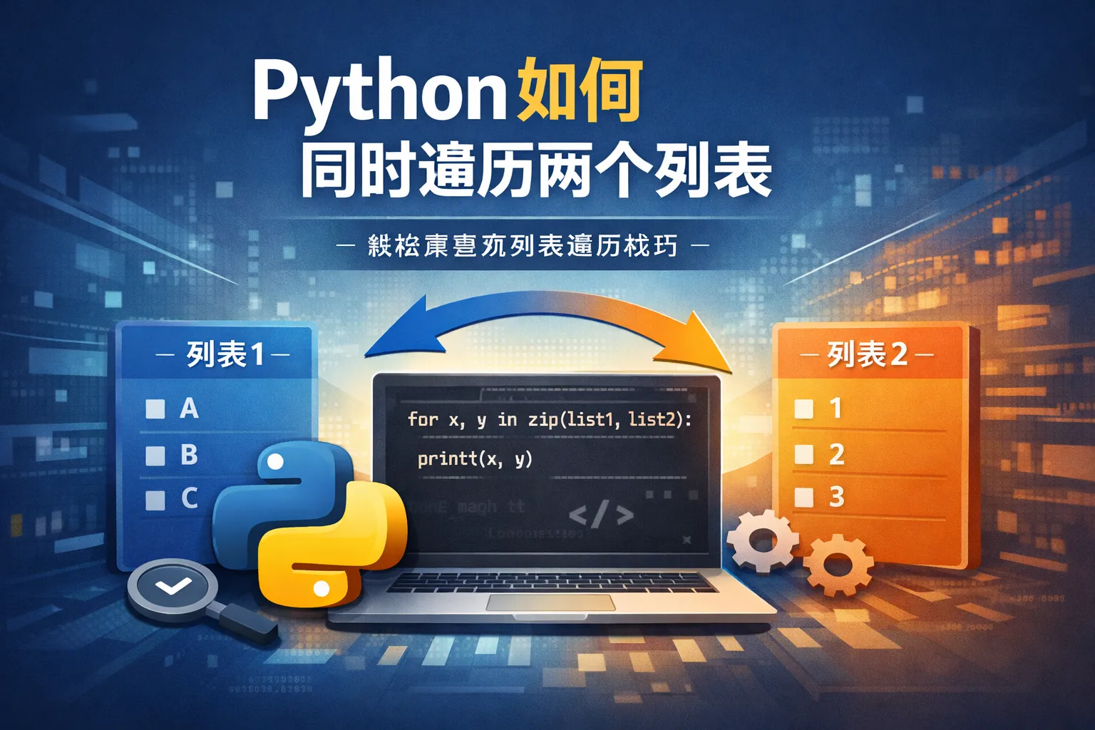 可以使用Python内置的zip函数,它会将两个列表对应位置的元素打包成元组,从而实现同时遍历。例如: