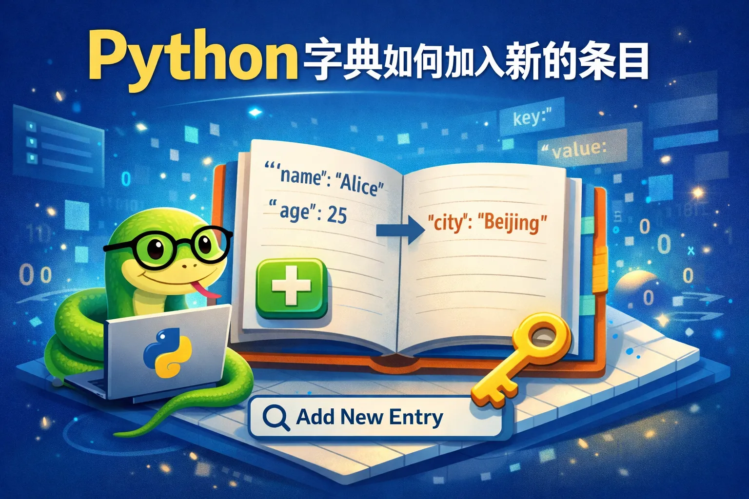 可以通过直接赋值来添加新的键值对。例如,假设字典名称为dict_data,添加新条目可以写成 dict_data['新键'] = '新值'。如果键不存在,Python会自动创建该条目。