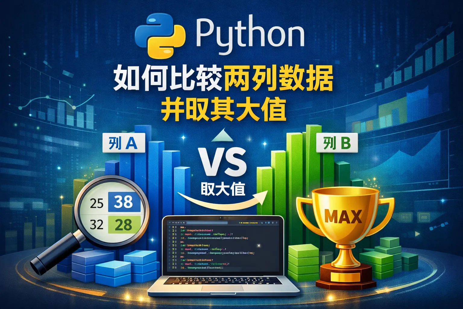 可以使用for循环逐行比较两列值,或者借助NumPy或Pandas等库的向量化操作进行高效比较。例如,利用Pandas的DataFrame,可以直接用df[['列1', '列2']].max(axis=1)来获取每行的最大值。