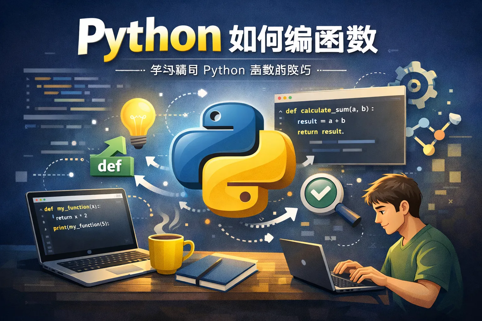 在Python中,定义函数使用关键字 def,后面跟上函数名称和括号内的参数列表,最后以冒号结束。函数体内的代码块需要缩进,例如: