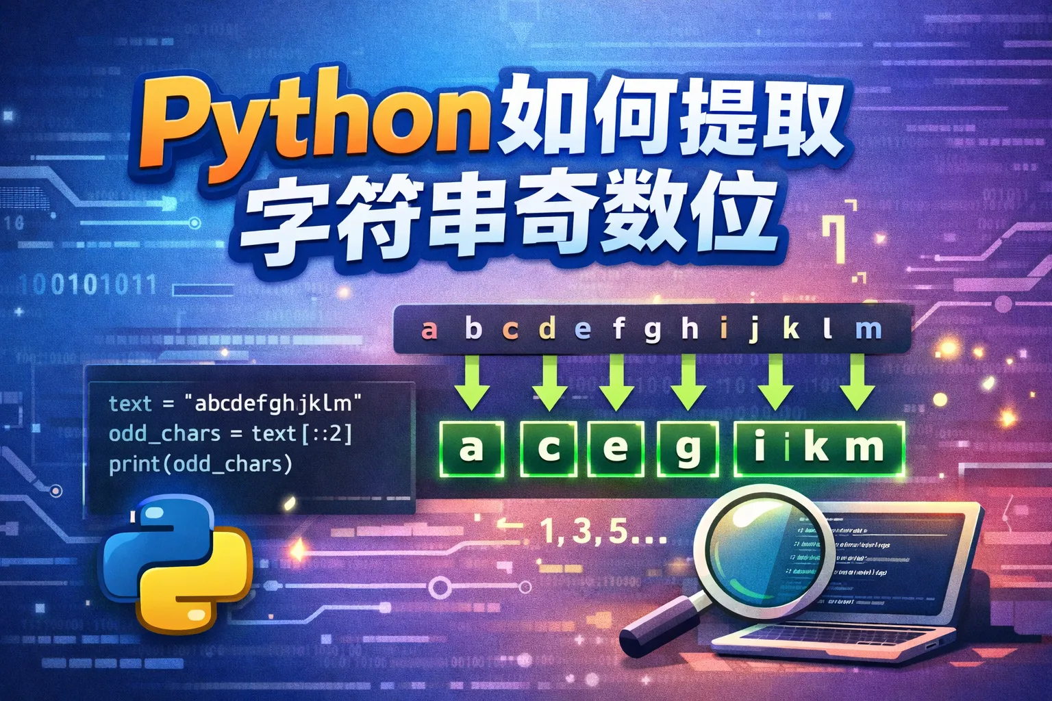 Python字符串索引从0开始计数,所以索引1、3、5等位置的字符是奇数位。提取这些字符意味着获取字符串中序号为奇数的字符,而不是传统意义上的字符位置。