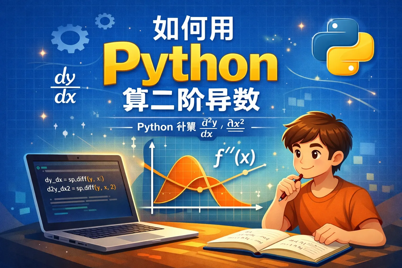 可以用SymPy库,它是一个符号数学包,支持符号微分。例如,定义符号变量x和函数f,然后用diff(f, x, 2)即可求得二阶导数。另外,SciPy库中的approx_derivative函数在数值计算中也很实用。